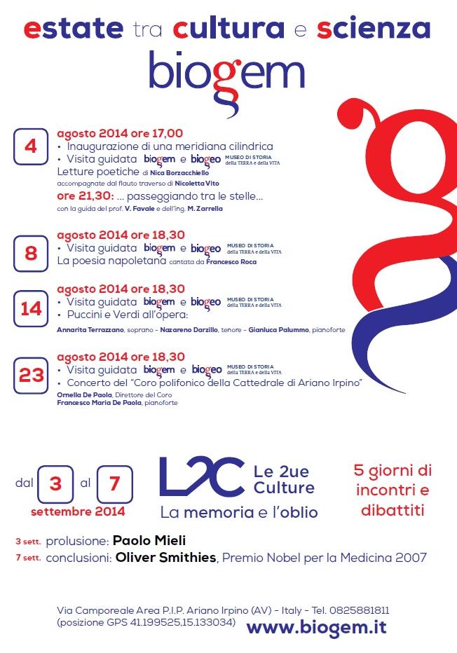 Ecco gli interessanti appuntamenti proposti per l’estate 2014 da “biogem”, avanzatissima realtà scientifico-culturale dell’Alta Irpinia, con sede ad Ariano Irpino (Av), entro il programma “Le 2ue Culture“: La memoria e l’oblio.